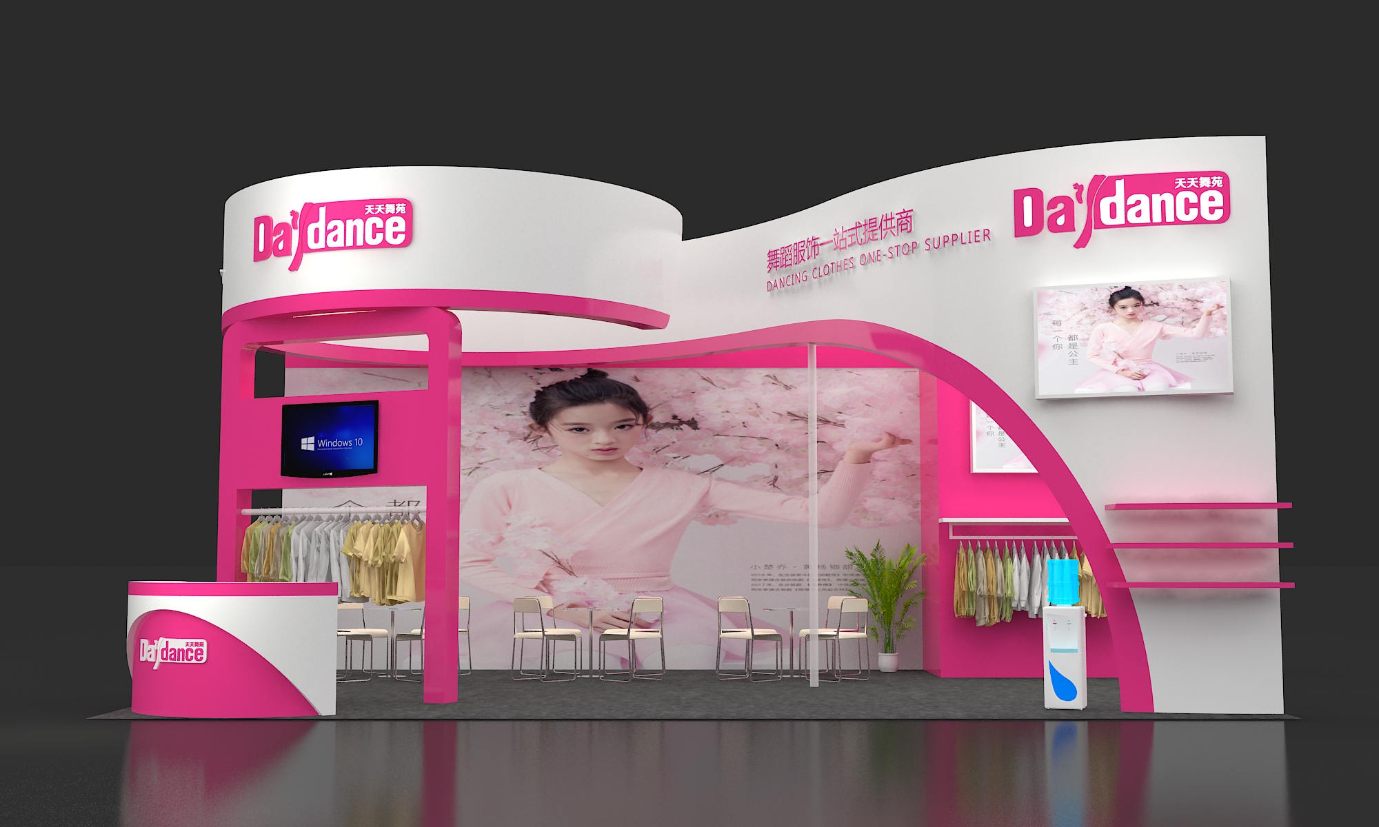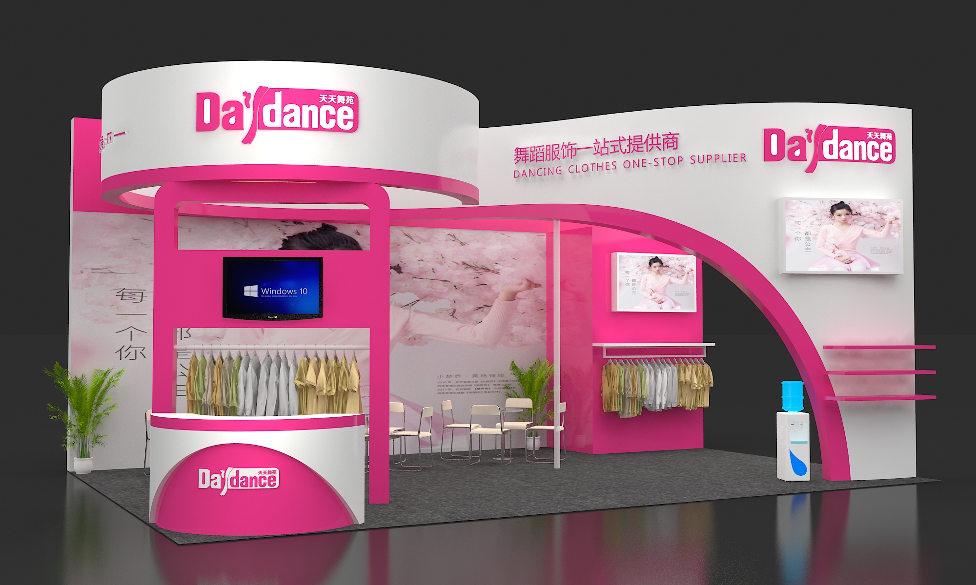 第二點,嚴(yán)格控制顏色運用,通常主色調(diào)只使用1種,輔助色最多不超2種。輔助色要盡量用于展臺整體線條輪廓的勾勒。